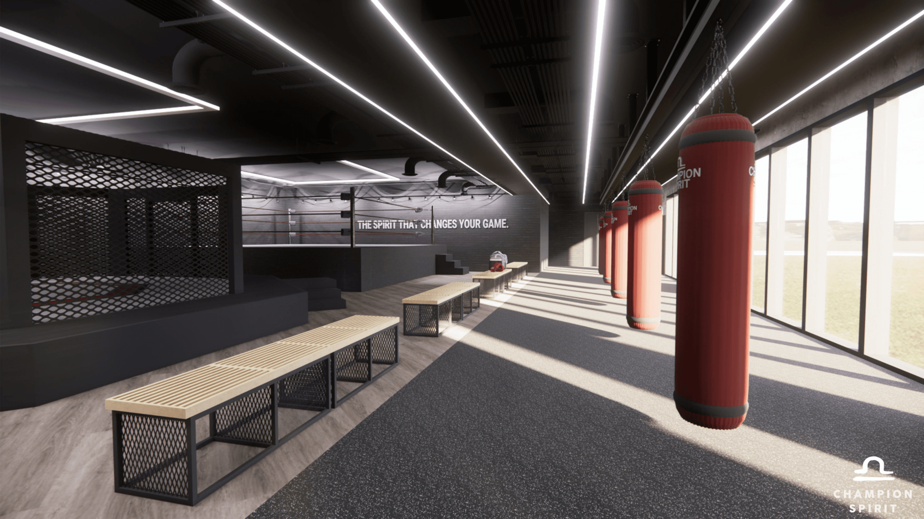The fusion of lights and shadows to depict performance. Wood as a gateway to serenity and warmth, revealing a contrast with the subdued color of the space.